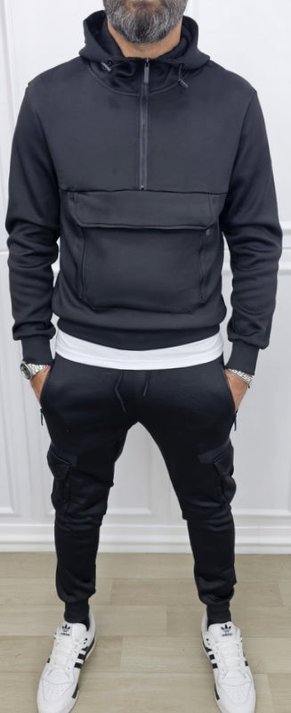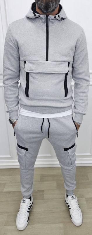 Fantastica tuta cargo internamente felpata disponibile in 2 colorazioni nero, grigio, composta da pantalone con 2 tasche laterali 2 + 2 sulle gambe elastico in vita e caviglie a molla , laccetti regolabili in vita , felpa cappuccio, tascone grande sul petto e laterali , cursore centrale polsini a molla nuova collezione autunno/inverno 2026