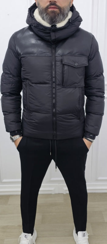 Giubbino uomo con cappuccio estraibile colore nero con collo in eco pelliccia, tessuto impermeabile con ecopelle sul petto ,interno foderato, 4 tasche esterne , ed 1 interna.