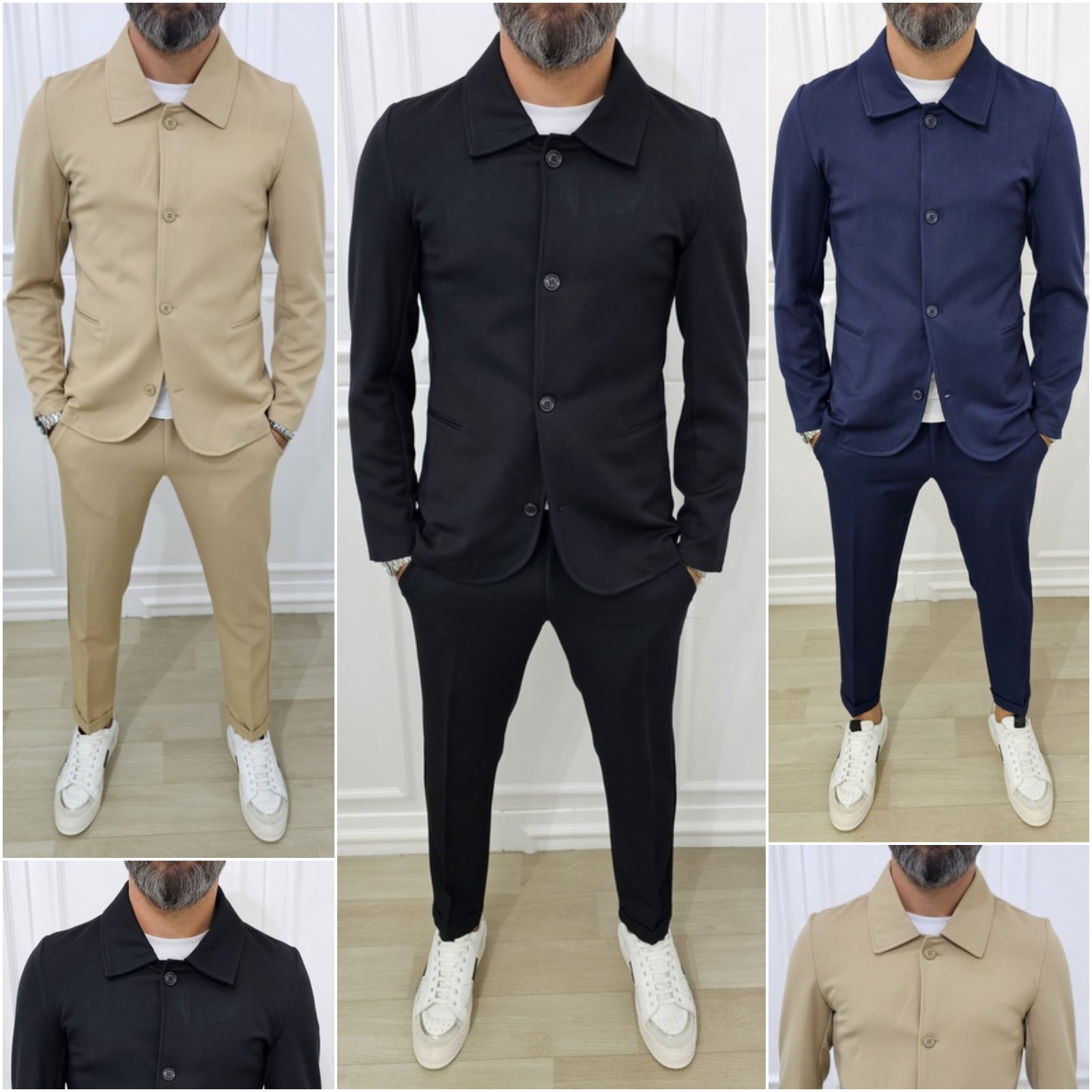 Fantastico abito completo made in Italy composto da giacca con collo a camicia e pantalone in tessuto invernale elastico, vestibilita' slim fit ,Giacca con 4 bottoni collo a camicia, pantalone bottone in vita con elastico sul retro per rendre piu' comodi i movimenti, passanti x cintura ,risvoltino alle caviglie, Ideale per un look casual, giovanile e di tendenza.