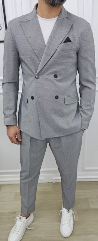 Fantastico abito doppiopetto made in Italy in tessuto elastico fantasia sale e pepe (bianco e nero) composto da giacca foderata con taschino interno ,pochette richiudibile, 2 tasche esterne, pantalone 2 tasche laterali,2 sul retro, passanti x cintura , T-shirt inclusa per un abbigliamento classico sportivo.